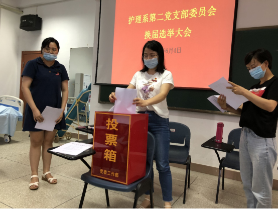 大会随后表决通过上一届支部委员会工作报告,通过了选举办法和监票人、计票人名单。按照大会通过的选举办法,参会党员通过无记名投票方式对新一届支部委员会委员进行了差额选举,选举产生新一届党支部委员会委员。其中洪霞、李冬秀、向月、陈婷玉4名同志当选护理系第二党支部新一届支部委员会委员。会后召开了新一届党支部委员会第一次全体会议,选举洪霞同志为党支部书记,李冬秀同志为党支部副书记,并对委员进行了工作分工,选举结果报党总支批准。会上,洪霞同志作表态发言,在护理党总支的指导下,护理系第二支部今后将紧紧围绕学校教育教学及党建工作,带领本支部党员以更加饱满的热情和更加昂扬的精神面貌投入到工作、学习和各项活动中去,充分发挥党员教师的凝聚力和战斗力,认真履行职责,扎实推进支部的各项建设,力争在学校教育教学、教科研、党建活动中作出贡献和成绩。