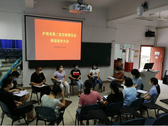 2020年6月4日,护理系第二党支部在护理系208召开了换届大会,会议由支部副书记陈雪珍同志主持,护理系党总支副书记林桂松同志出席并讲话。首先陈雪珍同志代表护理系第二党支部向大会作了工作报告,报告从组织建设、思想建设、党员教师队伍建设、党风廉政建设、发挥党员先锋作用等方面对本届支部委员会在过去三年中的工作进行了全面回顾和总结。
