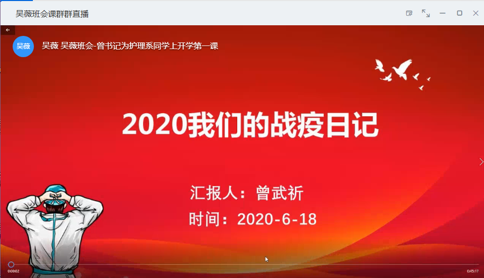 6月18日下午,校党委书记曾武祈以“2020我们的战疫日记”为主题,为18级助产专业同学讲授复学第一课,分享中国的“战疫”制胜之道以及学院在此次“战疫”中的经验做法,深情寄语同学们在奋斗中做最美的白衣天使。6月18日晚,18级各班辅导员开展线上线下班会,组织全体18级返校同学“云端”收看校党委书记曾武祈返校复学第一课。
