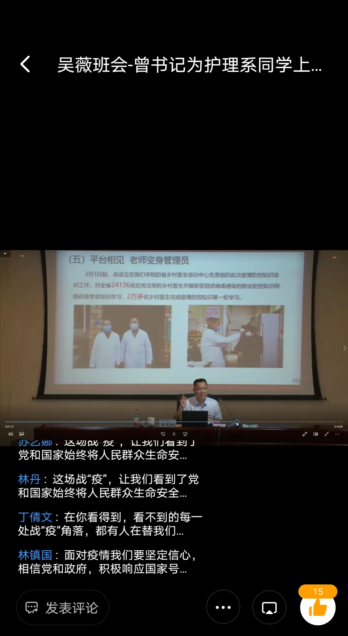 在观看过程中,同学们感触颇深,纷纷在“云端”留言。他们表示,此次“战疫”,让他们感受到,作为中国人是多么的自豪!今生不悔入华夏,来生还做中国人!