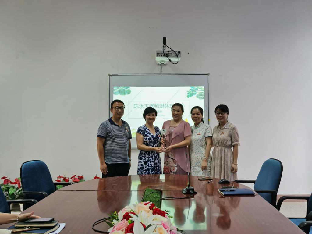 谢涛书记代表全体教职工向陈永玉老师赠送纪念品,表达老师们由衷的敬意和深深的祝福。
