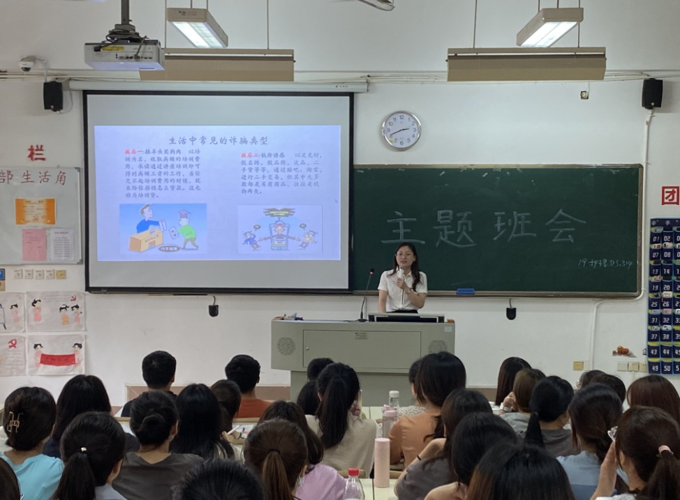 会上,辅导员李英从诈骗的实质、常见的诈骗类型、容易被骗的不良心理及应对方式几个方面进行了讲解。