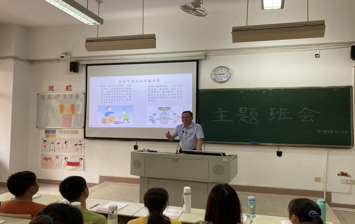 为了使大学生熟悉生活中常见的诈骗形式,增强防范诈骗的意识,提高自我预防、自我保护、自我应对的能力,2021年4月2日,19护理313班在教215组织召开“防范诈骗”主题班会。校党委书记曾武祈作为联系班级领导,亲临班会现场给19护理313班同学带去学校领导的关心和指导,参加此次班会的还有护理学院党总支书记谢涛和党总支副书记林桂松。