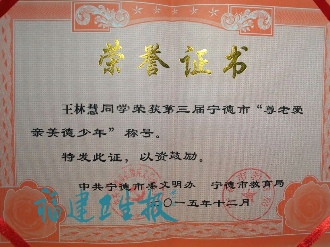 王林慧成绩优异,连年获得奖学金,被评为“三好学生”等荣誉称号。放假期间,她还积极参加社会实践活动,结合专业所学尽力帮助他人。曾获得“美德少年”、“自强之星”等荣誉称号。曾获第十届全国青少年冰心文学大赛预赛一等奖。近日,在宁德市“争做新时代向上向善好青年”主题活动中,她还入选崇德守信好青年。