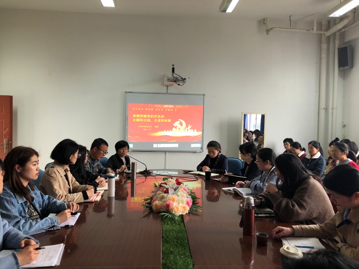 为深入学习宣传贯彻习近平新时代中国特色社会主义思想,大力推进党史学习教育,2021年4月8日,护理学院党总支在护理学院会议室开展“准确把握党的历史主题和主线、主流和本质”——学党史 悟思想 办实事 开新局专题党课,本次党课由护理学院党总支书记谢涛主讲。