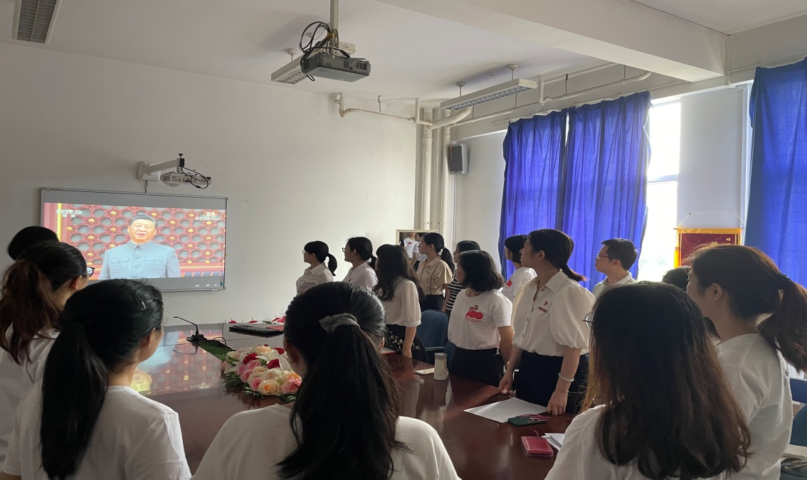 7月1日上午,护理学院党总支组织党员师生、入党积极分子收听收看庆祝中国共产党成立100周年大会直播实况,中国共产党最高领导人习近平站上天安门城楼,代表中国共产党向世界做一次重要宣示——这是一个百年政党对历史的传承赓续,也是一个世界大党面向未来的再一次出发。
