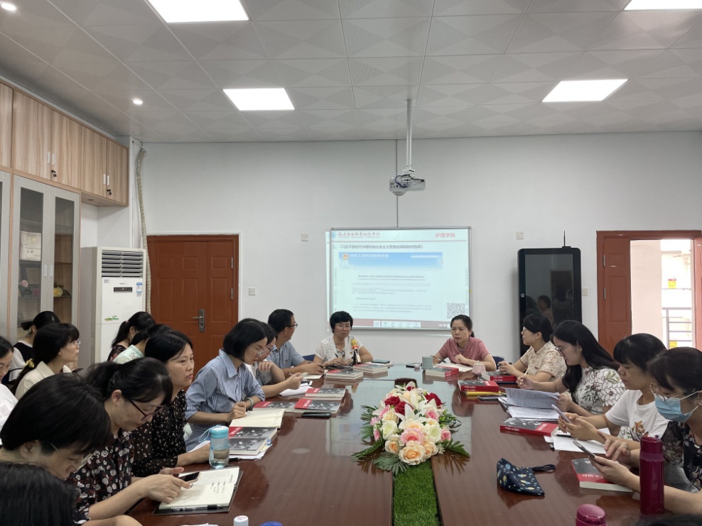 为全面贯彻党的教育方针,落实立德树人根本任务,扎实推进习近平新时代中国特色社会主义思想进课程教材,2021年9月1日,护理学院召开系部会议,会上学习了《关于深入学习宣传贯彻党的教育方针的通知》和《习近平新时代中国特色社会主义思想进课程教材指南》。会议由护理学院党总支书记谢涛主持,护理学院全体教师参加。
