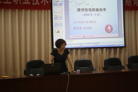 4月29日下午台湾大仁科技大学护理系主任黄美惠助理教授应邀莅临我院开展题为《护理情境模拟教学—OSCE介绍》的专题讲座,院长郭素华、副院长廖伟坚以及教职员工、学生代表100多人聆听了本次讲座,讲座由护理系书记谢涛副教授主持。 黄美惠主任在讲座中详细介绍了OSCE(客观结构化临床考试)的起源、发展、应用及评价。黄教授的报告内容丰富、观点新颖、语言风趣、求真务实,为我校师生拓宽了视野。讲座结束后黄教授与我院老师就OSCE的建设、教学、竞赛等方面进行了热烈的探讨和交流。(科研处)