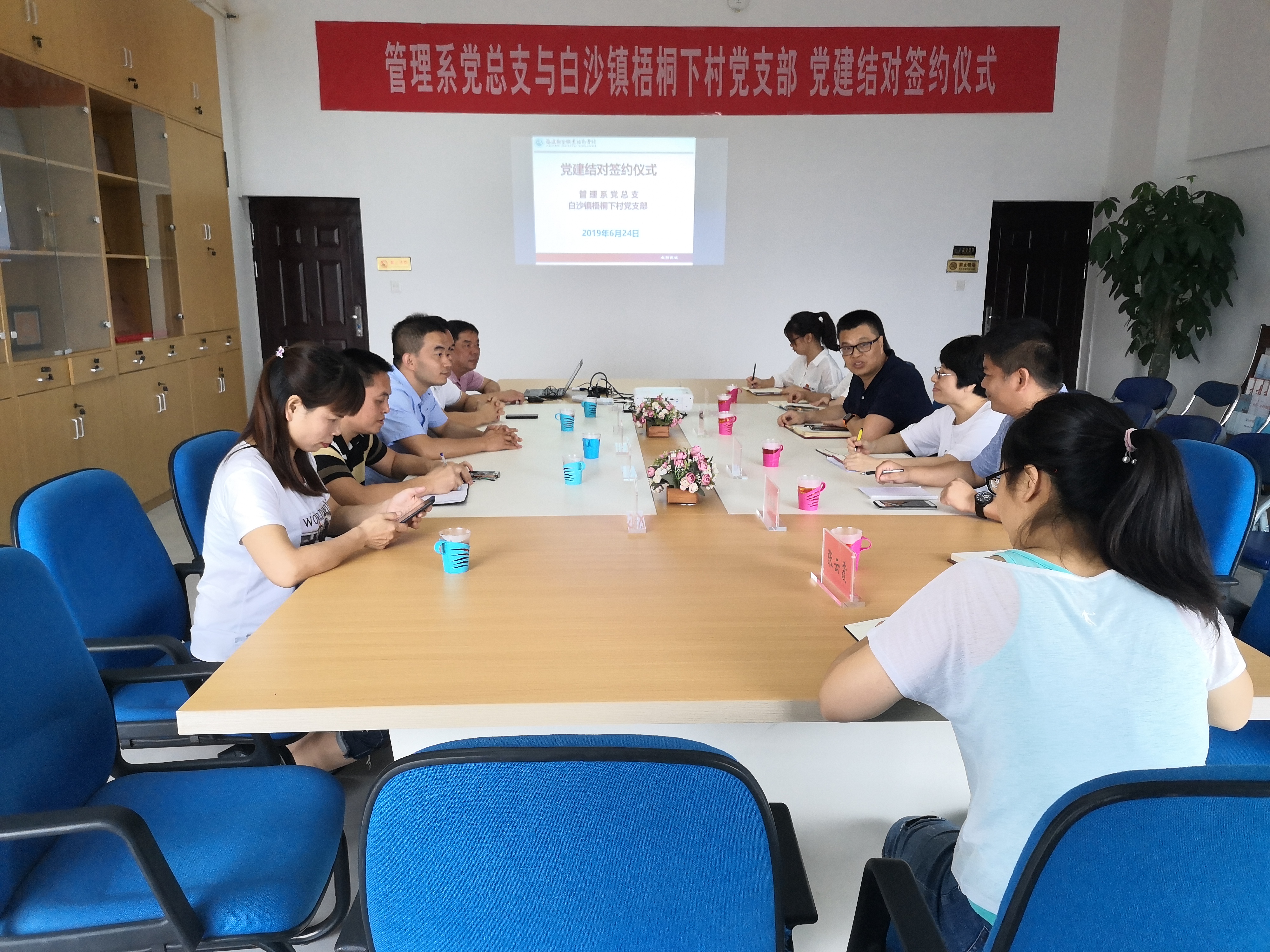为进一步提升党建工作活力,彰显党建工作实效,更好地服务基层发展,6月24日上午,我院管理系党总支与白沙镇梧桐下村党支部党建结对签约仪式在管理系会议室举行,白沙镇党委挂职副书记贺纪平、白沙镇组织部长林春欣、县委下派挂职第一书记王卫东、梧桐下村书记张翔、村长周丽玉参加会议。
