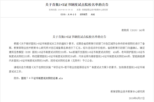 《关于在院校实施“学历证书+若干职业技能等级证书”制度试点方案》是教育部为贯彻《国家职业教育改革实施方案》,推进新时代职业教育改革发展,把学历证书与职业技能等级证书结合起来的方案,1+X证书制度体现了职业教育作为一种类型教育的重要特征,是落实立德树人根本任务、完善职业教育和培训体系、深化产教融合校企合作的一项重要制度设计。通过执行1+X制度,能显著提高我院人才培养质量,深化人才培养模式和评价模式改革,探索畅通技术技能人才成长通道。