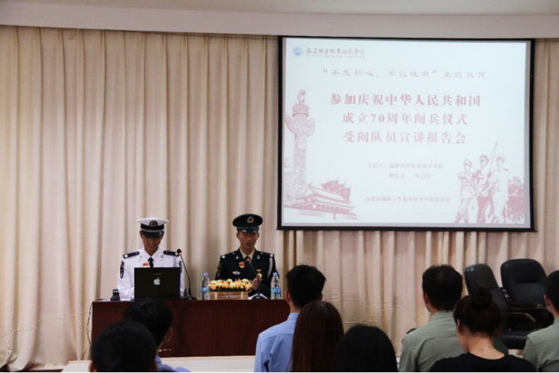 10月24日下午,我校举行参加庆祝中华人民共和国成立70周年阅兵仪式受阅队员宣讲报告会,面向青年学生开展“不忘初心、牢记使命”主题教育。受阅归来的来自福建信息职业技术学院的陈东生、涂百仲两位老师带来了一场生动的受阅经历分享报告。校纪委书记游锋出席报告会,校团委负责同志、青马班学员、八一学社师生共计100名参加。