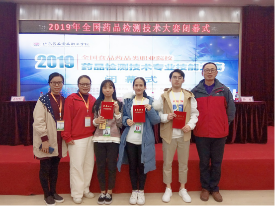 2019年全国食品药品类职业院校“药品检测技术”技能大赛于11月1至3日在山东药品食品职业学院举行。药学系黄智伟、陈雪萍、吴婉婷三名同学组成的学生团队荣获团体二等奖的好成绩。