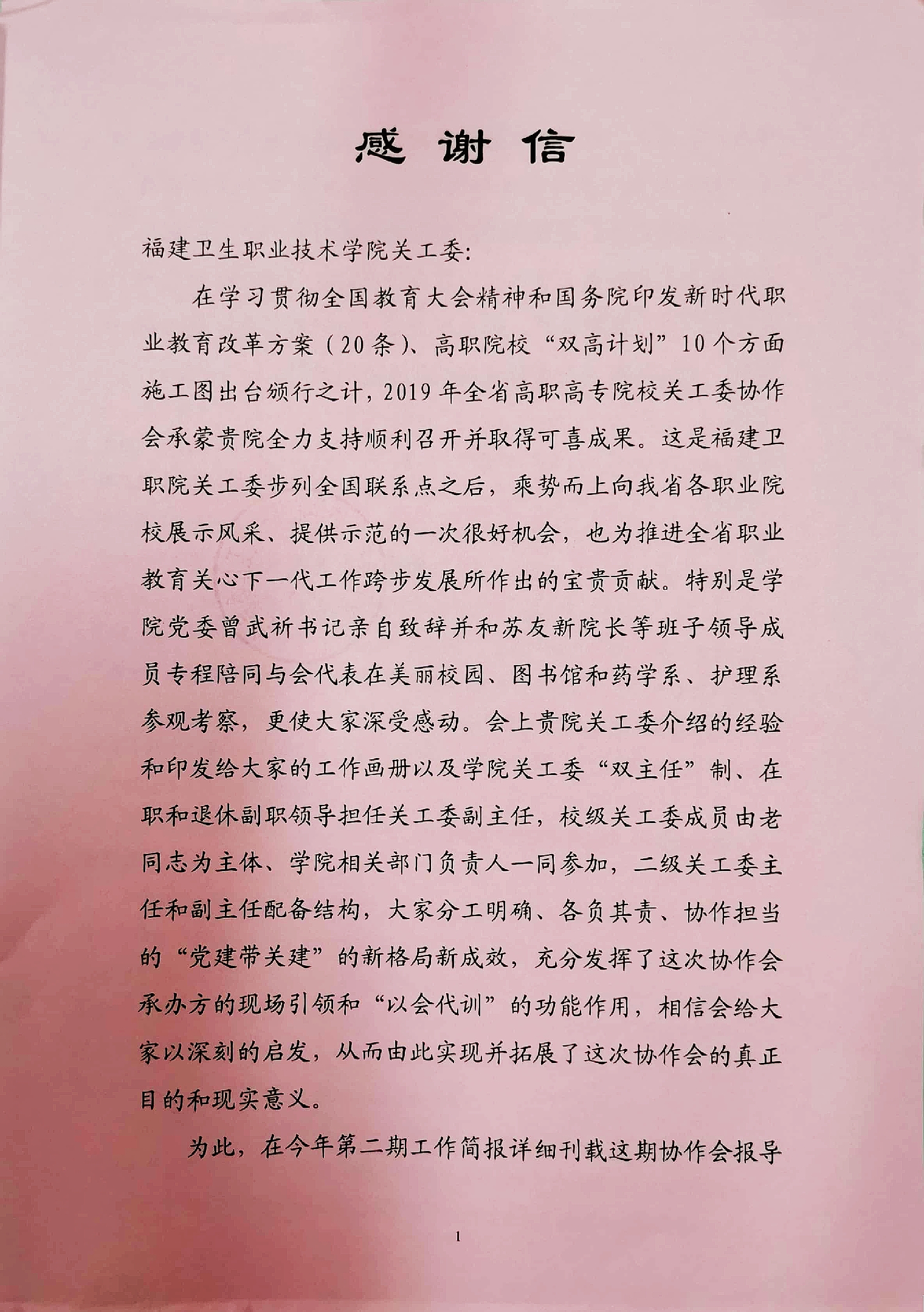 近日,我院关工委收到了来自福建省教育系统关工委2019年第2期的简报以及感谢信,感谢我院全力支持2019年全省高职高专院校关工委协作会的召开,并取得可喜成果,并衷心祝愿我院事业发展和关工委工作谱写新篇章,更好地展示全国职业院校联系点新风貌。