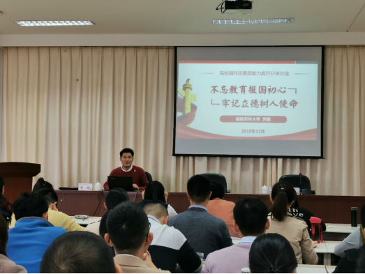 为提升我校辅导员的理论水平、专业素养,促进辅导员工作的专业化、职业化,提高辅导员的素质能力竞赛水平,11月26日,学工处特邀请曾获第七届全国高校辅导员素质能力大赛三等奖、第七届福建省高校辅导员素质能力大赛一等奖的福建农林大学优秀辅导员黄鹏做主题为“牢记教育报国初心,不忘立德树人使命”专题辅导员素质能力提升讲座。讲座由学工处副处长林燕主持,全体专、兼职辅导员参加。