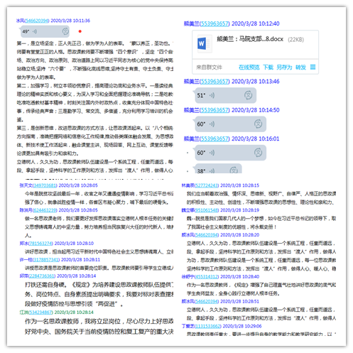 2020年3月28日上午,直属马克思主义学院党支部召开线上党员大会,集中学习《新时代高等学校思想政治理论课教师队伍建设规定》《教育部有关部门负责人就<新时代高等学校思想政治理论课教师队伍建设规定>答问》等6份文件。会议由党支部书记熊美兰主持,全体教师党员参加了会议。教师们在会议上畅谈心得和感想,掀起学习讨论热潮。