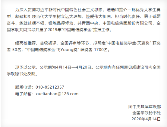 “中国电信奖学金”遴选寻访活动自2019年4月启动以来,得到全国高校的广泛关注和青年学生的积极参与,涌现出一大批在各项领域成绩显著的青年学生典型。遴选寻访活动以来,院团委积极宣传,广泛发动,深入挖掘优秀青年典型。经过学院评选、省级初评、全国评审及结果公示,最终我院王虹雨同学获得“中国电信奖学金·飞Young奖”。