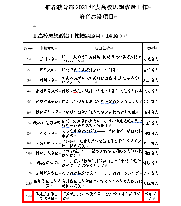 近日,中共福建省委教育工委2021年度高校思想政治工作有关培育建设项目公布了公示名单,我校学生工作部资助管理中心申报的“‘天使文化,大爱无疆’融入资助育人实践探索”项目,拟立项省级高校思想政冶工作培育建设项目,并且拟作为我省“高校思想政冶工作精品项目”向教育部推荐。特别值得一提的是:我省拟向教育部推荐的精品项目共14项,其中13项均为本科院校项目,我校学生工作部申报的项目,是唯一一所高职院校项目。
