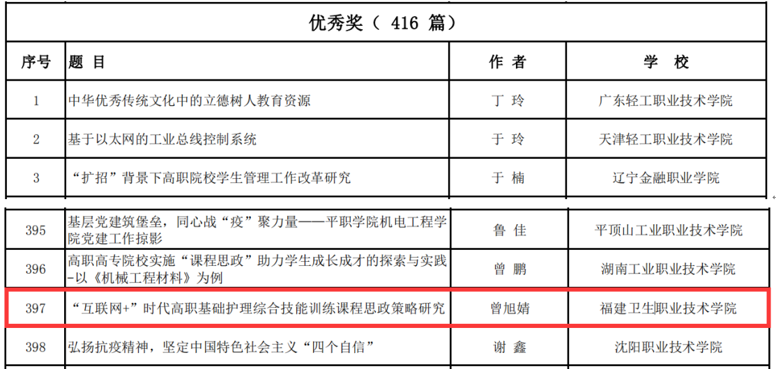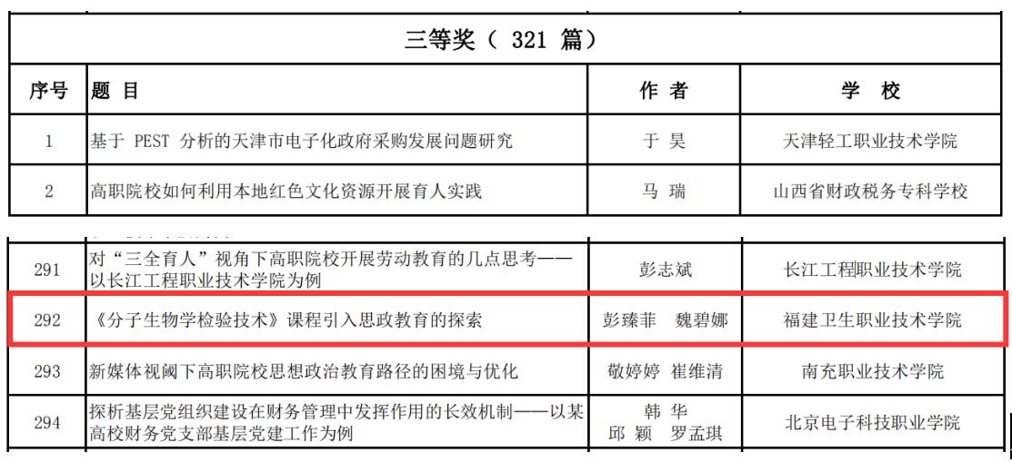 彭臻菲、魏碧娜老师撰写的《<分子生物学检验技术>课程引入思政教育的探索》、曾旭婧老师撰写的《“互联网+”时代高职基础护理综合技能训练课程思政策略研究》两篇论文分别荣获全国高职高专党委书记论坛2020年优秀论文三等奖和优秀奖。