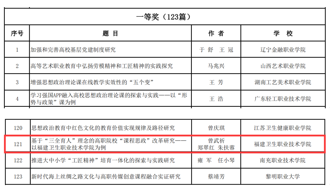 根据全国高职高专党委书记论坛学术委员会的评选结果,我校曾武祈、郑翠红、朱扶蓉撰写的《基于“三全育人”理念的高职院校“课程思政”改革研究——以福建卫生职业技术学院为例》喜获全国高职高专党委书记论坛2020年优秀论文一等奖。