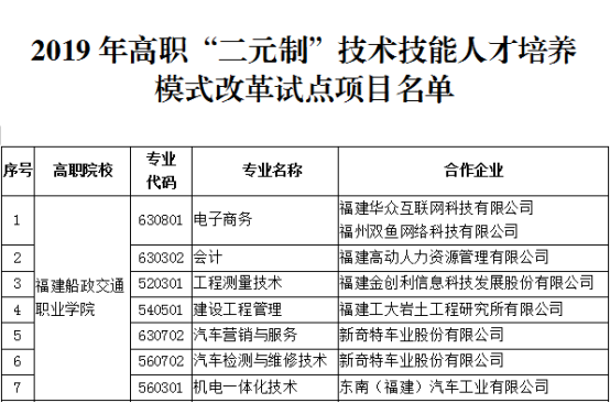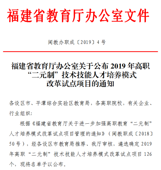 根据《福建省教育厅关于进一步加强高职教育“二元制”人才培养模式改革试点项目管理的通知》(闽教职成〔2018〕50号),我院与福建承天金岭药业有限公司合作开办的中药学专业确定为2019年高职“二元制”技术技能人才培养模式改革试点项目。