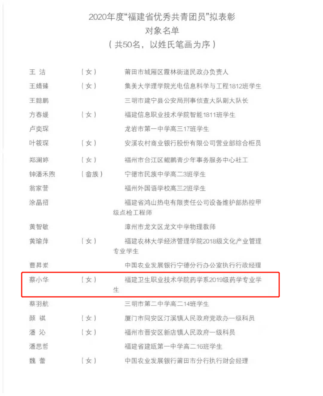 根据《关于开展2020年度“福建省优秀共青团员”“福建省优秀共青团干部”“福建省五四红旗团委(团支部)”评选表彰的通知》和《共青团福建省委 福建省青年联合会关于开展第十八届“福建青年五四奖章”评选表彰活动的通知》要求,对2020年度“两红两优”集体和个人进行了表彰。我校2019级药学专业学生蔡小华荣获2020年度“福建省优秀共青团员”。