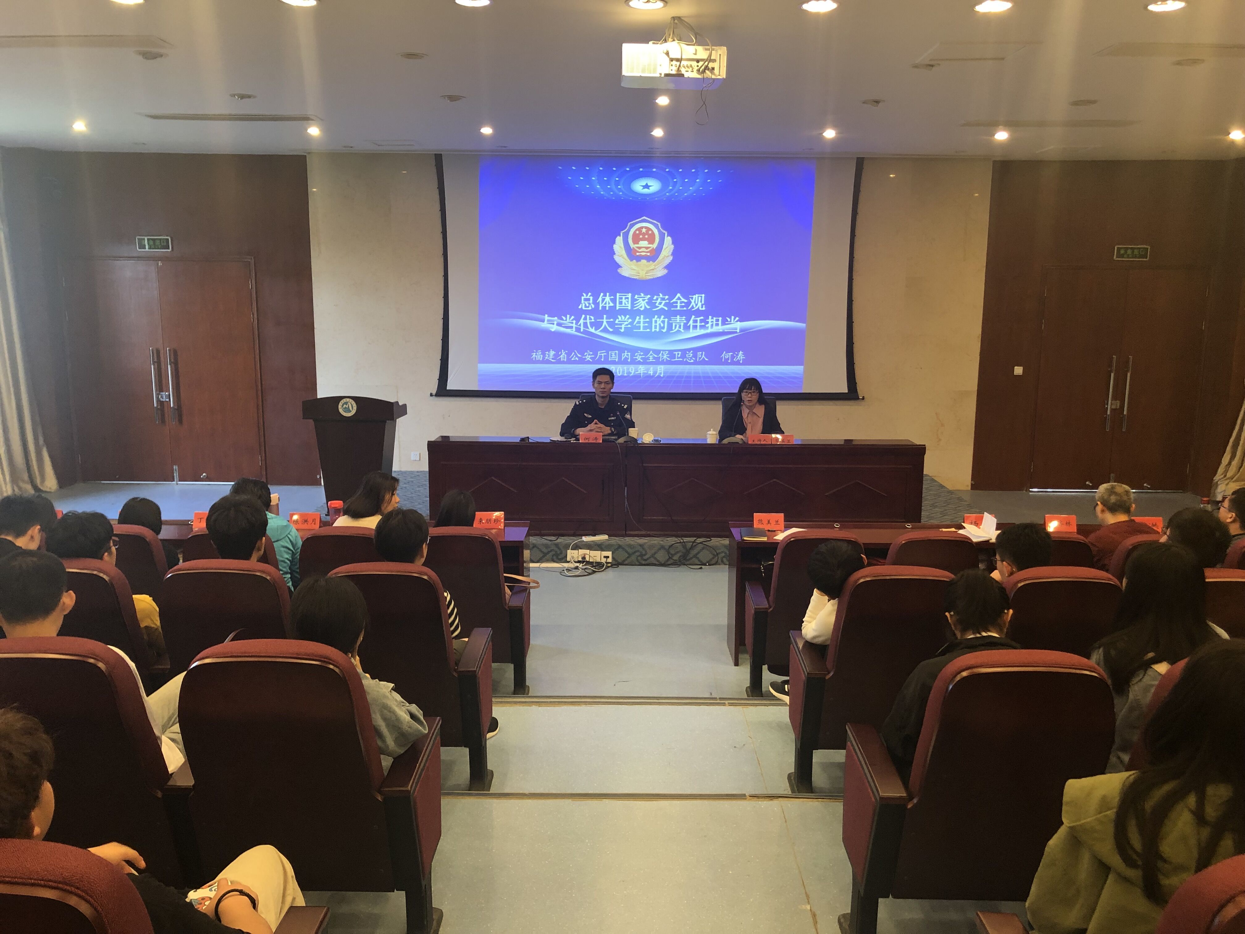 为深入学习贯彻习近平新时代中国特色社会主义思想,坚持总体国家安全观,着力防范化解重大风险,结合福建卫生职业技术学院4·15国家安全日教育系列活动要求,4月18日下午,福建省公安厅一级警长何涛受邀在我院实训楼四楼报告厅为广大师生开设题为《总体国家安全观与当代大学生的责任担当》的专题讲座。讲座由马克思主义学院院长熊美兰主持,思想政治理论课教师,习近平新时代中国特色社会主义思想读书社、时代先锋协会等马克思主义理论学生社团成员,校舆情引导队和药学系等学生代表等共230多人参加了此次讲座。