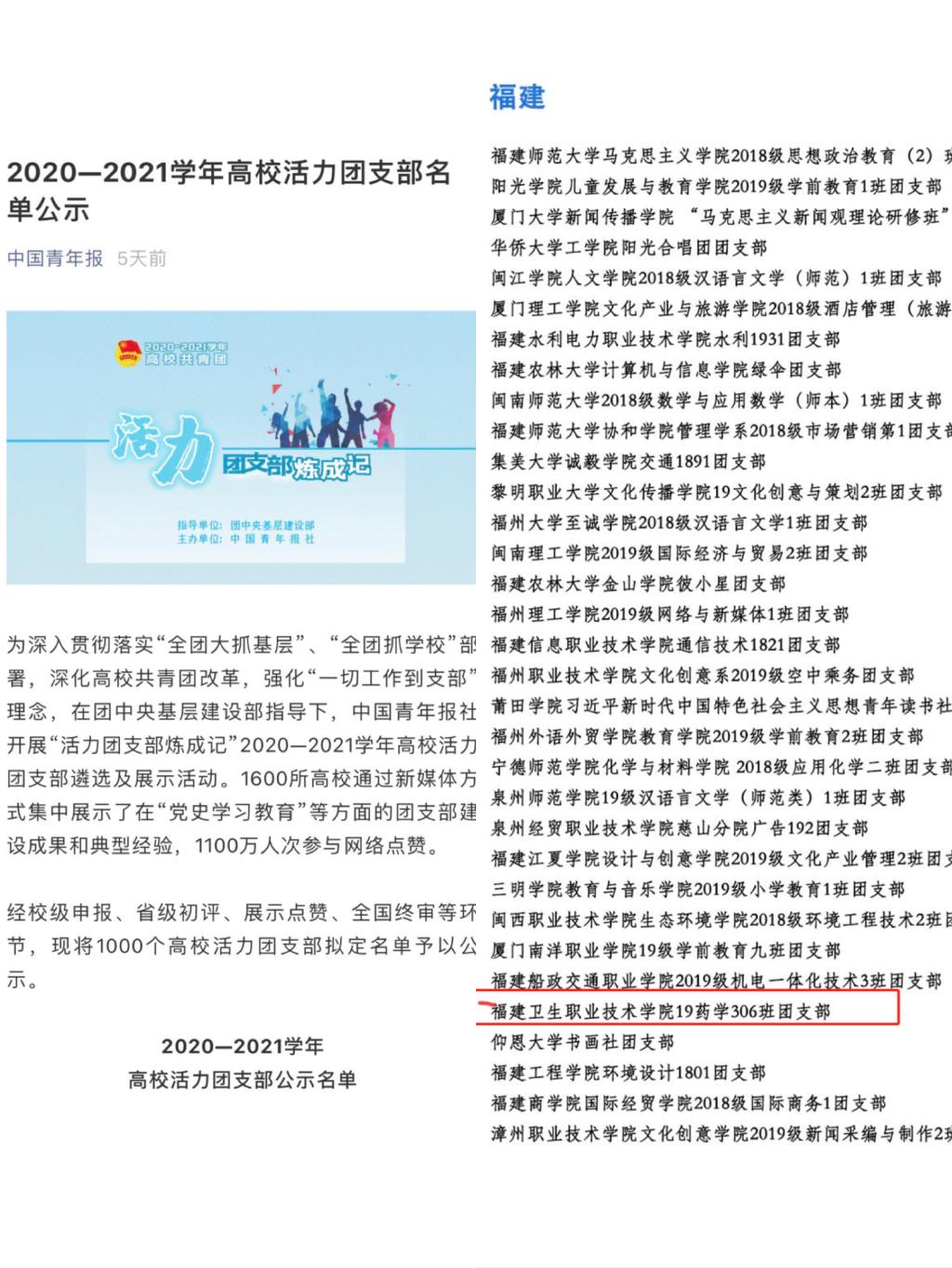 为深入贯彻落实“全团大抓基层”、“全团抓学校”部署,深化高校共青团改革,强化“一切工作到支部”理念,在团中央基层建设部的指导下,中国青年报社开展全国高校活力团支部遴选及展示活动。经过新媒体展示评选,我校药学院19药学306班团支部荣获2020-2021学年高校活力团支部。