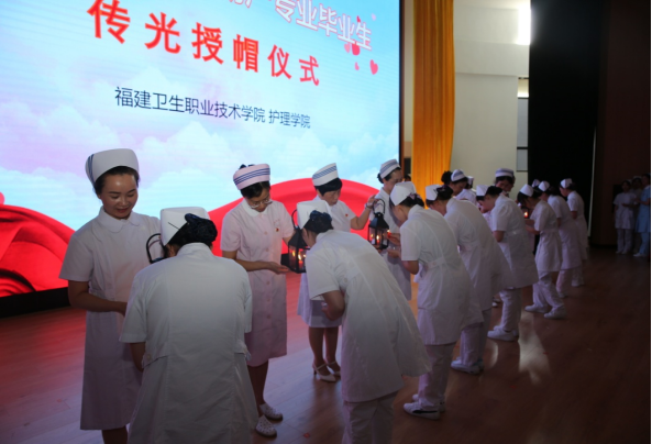 紧接着伴随着柔美的音乐进行神圣的授帽传光仪式。在护理学创始人南丁格尔像前,护理前辈们为单膝跪着的毕业生逐一戴上象征着圣洁天使的燕尾帽,毕业生接过前辈手中象征南丁格尔精神的奉献之火。白色的燕尾帽在红色烛光的映衬下,犹如神圣的光环照耀在每一个现场师生的心中。