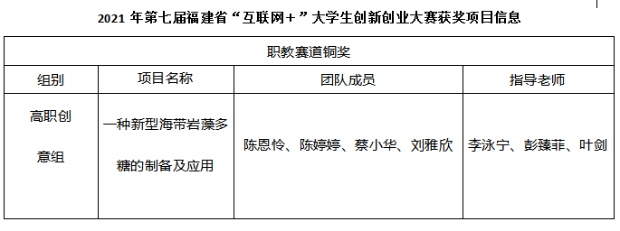 近日,由福建省教育厅会同11家单位举办的第七届福建省“互联网+”大学生创新创业大赛决赛会场传来捷报,我校学生不畏强手,奋力拼搏,最终斩获职教赛道铜奖。