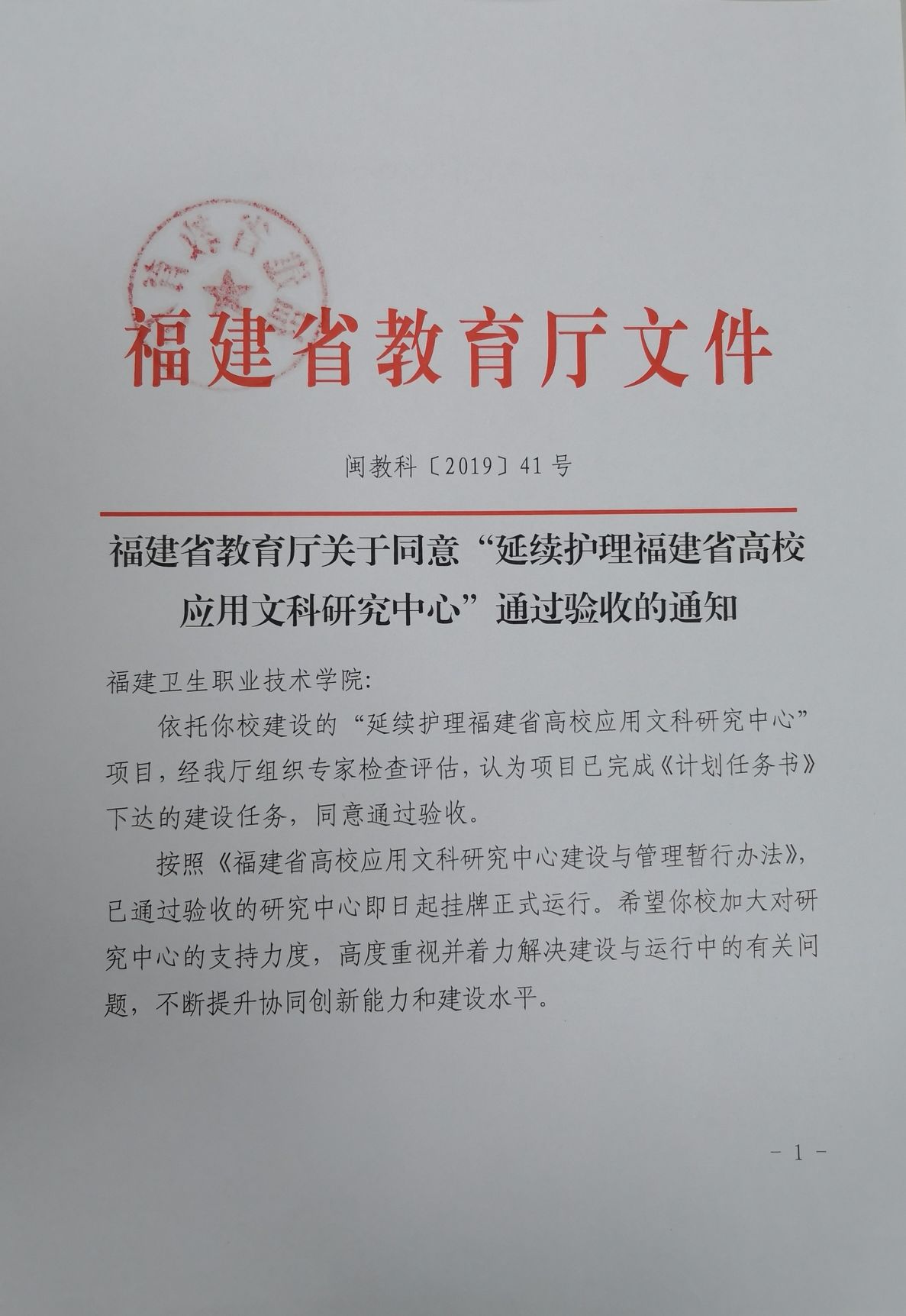近日,接《福建省教育厅关于同意“延续护理福建省高校应用文科研究中心”通过验收的通知》(闽教科[2019]41号),我院延续护理福建省高校应用文科研究中心(以下简称“延续护理中心”)正式通过省教育厅核准验收,准予挂牌“延续护理福建省高校应用文科研究中心”。