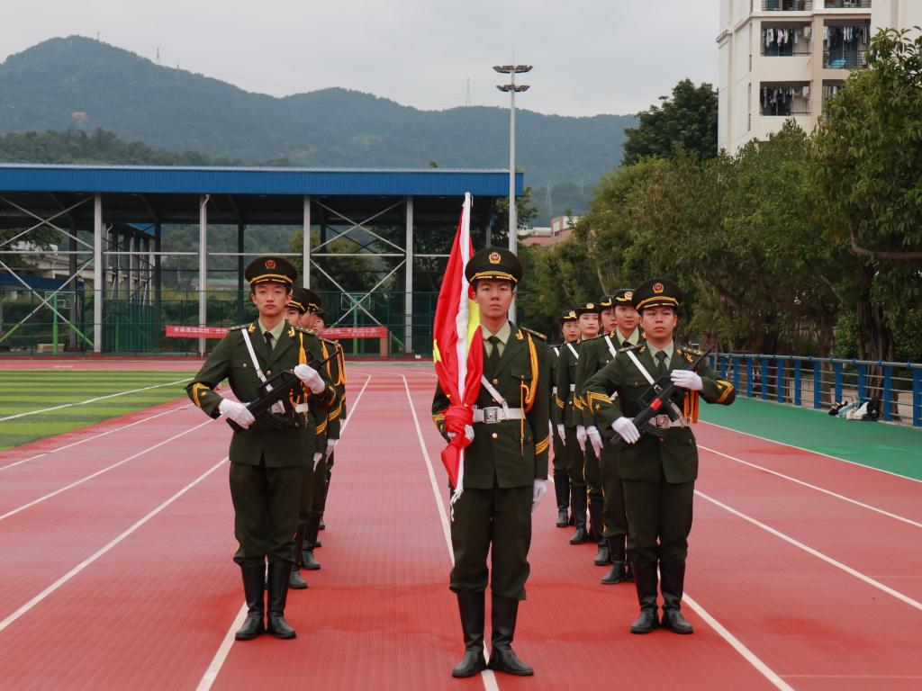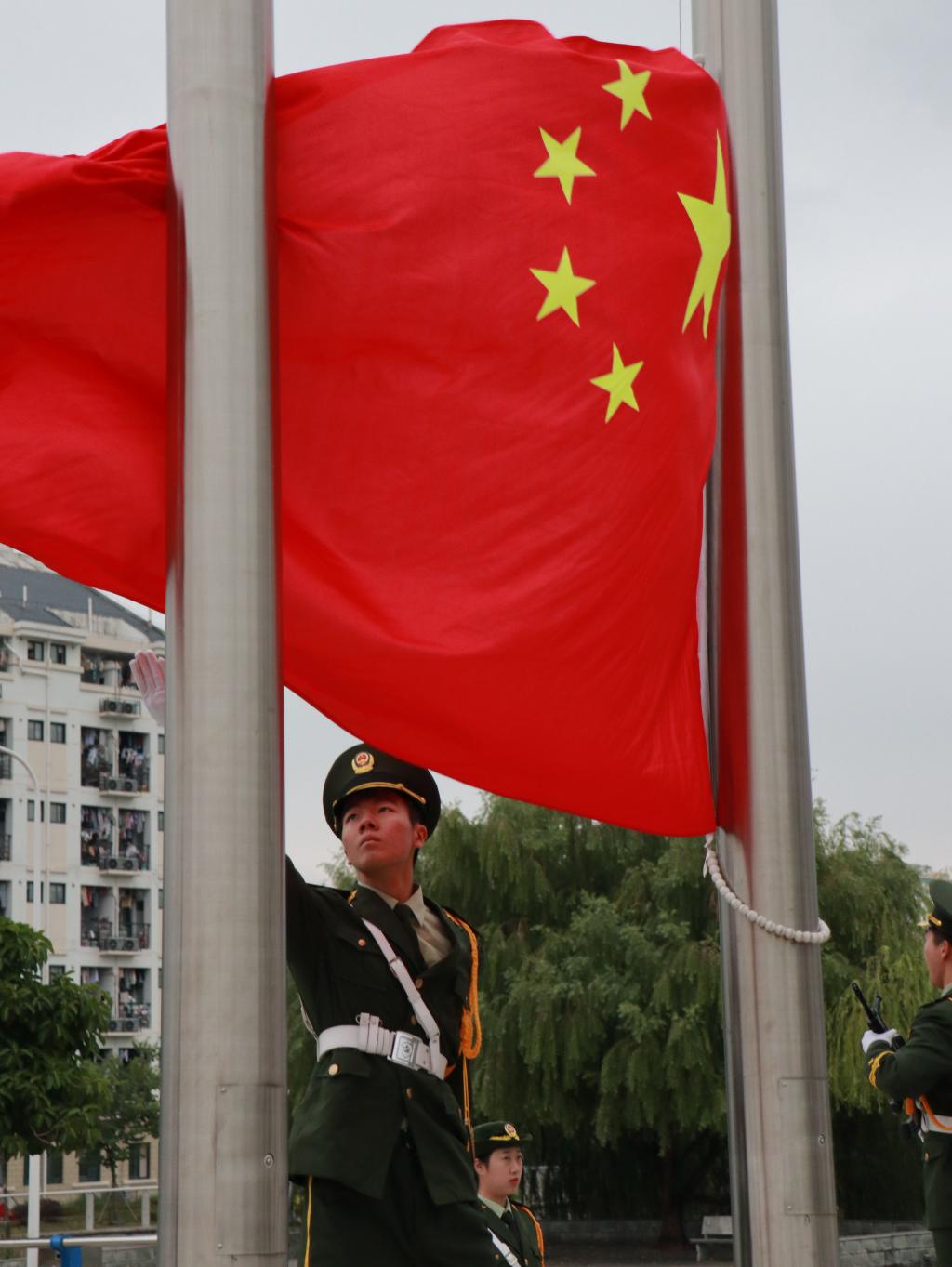 随着国旗护卫队矫健有力的步伐,雄壮的国歌声响起,典礼正式拉开序幕。向着秋雨洗礼过后的清空,五星红旗冉冉升起,全体师生向国旗敬礼。