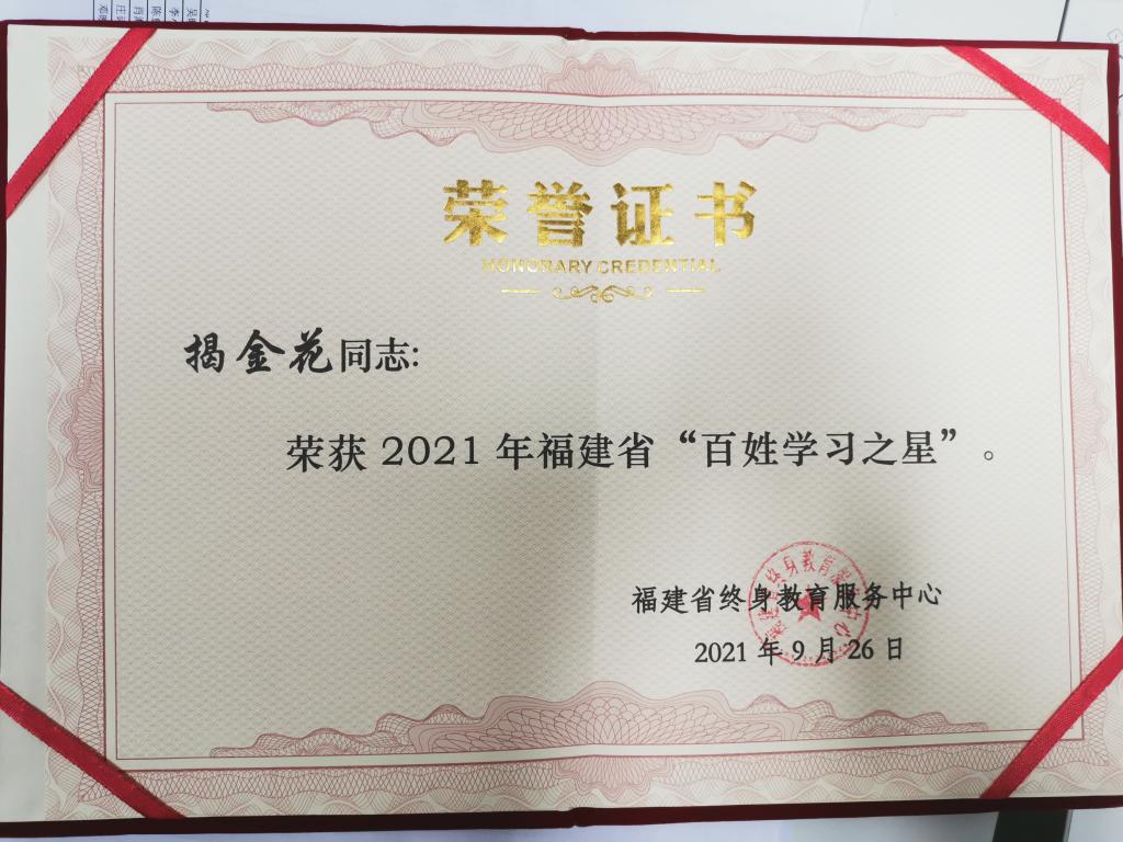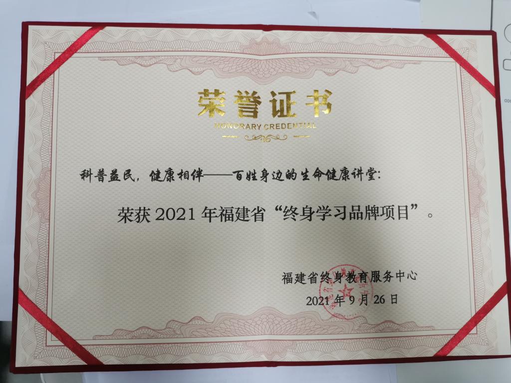 主会场活动上,还进行省级“百姓学习之星”“终身学习品牌”项目表彰。我校积极参与2021年福建省终身教育重点项目建设,“科普益民,健康相伴——百姓身边的生命健康讲堂”荣获福建省“终身学习品牌项目”,揭金花老师获“百姓学习之星”称号。