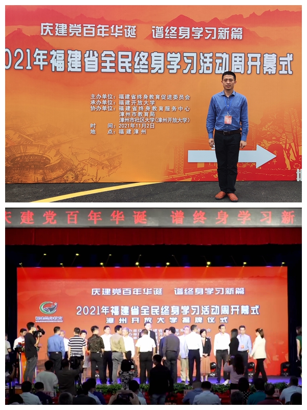 11月2日,2021年福建省全民终身学习活动周开幕式在漳州举行,这是福建省自《福建终身教育促进条例》颁布实施后的第16届全民终身学习活动周,主题是“庆建党百年华诞,谱终身学习新篇”。开幕式活动由福建省终身教育促进委员会主办,福建开放大学承办,福建省终身教育服务中心、漳州市教育局、漳州开放大学协办。开幕式主会场在漳州举行,继续教育学院副院长何烜作为我校代表参加了主会场的开幕式。