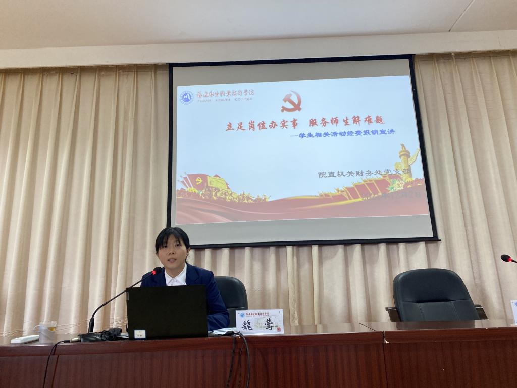 签约仪式后,一行人在行政楼六楼会议室开展“立足岗位办实事 服务师生解难题”金融安全知识及财务报销宣讲。中国建设银行福州鼓楼支行营业部副主任方晶晶结合支部专业特色,为我校师生宣讲金融安全知识,对诈骗的种类、形式及提高防骗意识进行了深入浅出、通俗易懂的讲解,具有较强的指导性和实用性。魏莺结合我校财务报销实际与师生需求进行了财务报销培训。