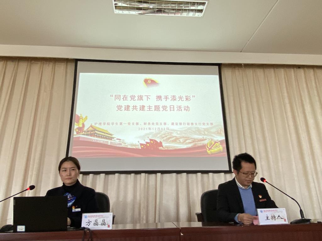为深入学习贯彻党的十九届六中全会精神,坚持以习近平新时代中国特色社会主义思想为指导,落实新时代党建工作新要求,拓展基层党建工作平台,创新党建共建工作模式,实现“1+1>2”的党建新效能,2021年12月2日,护理学院学生第一党支部与财务处党支部、中国建设银行福州鼓楼支行党支部联合开展“同在党旗下 携手添光彩”党建共建主题党日活动。护理学院党总支书记谢涛、财务处处长陈筱瑜、护理学院学生第一党支部书记吴锋、财务处党支部书记魏莺,中国建设银行福州鼓楼支行支部书记、行长陈继平一行出席,各院系团总支负责人参与活动。