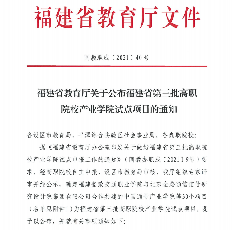 福建省高职院校产业学院试点工作,由高职院校自主申报,福建省教育厅组织专家评审,最终确定30个项目为福建省第三批高职院校产业学院试点项目。