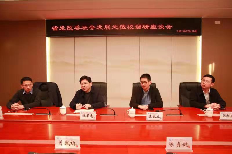 2021年12月10日,福建省发展和改革委员会(以下简称省发改委)社会发展处处长林显忠一行4人莅临我校调研,并在行政楼五楼会议室召开座谈会。校党委书记曾武祈、校长许能锋、副校长陈贞健以及后勤管理处、新建宿舍楼设计团队相关人员参加座谈。