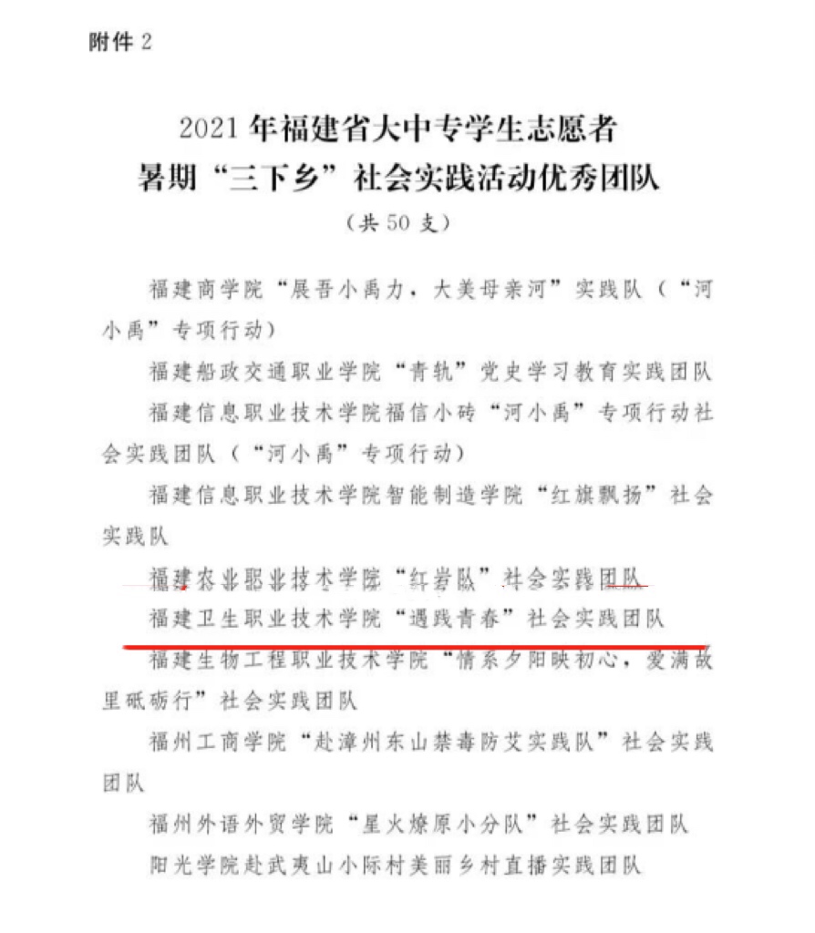 近日,中共福建省委宣传部、中共福建省委文明办、中共福建省委教育工委、福建省河长制办公室、共青团福建省委、福建省学生联合会联合下发《关于2021年福建省大中专学生志愿者暑期“三下乡”社会实践活动优秀集体和个人的通报》,我校被评为2021年福建省大中专学生志愿者暑期“三下乡”社会实践活动先进单位,这已是我校连续五年荣获此项荣誉。“遇践青春”社会实践队被评为福建省暑期“三下乡”社会实践活动优秀团队,林飞准老师获福建省暑期“三下乡”社会实践活动“先进工作者”称号,阮月新同学获福建省暑期“三下乡”社会实践活动“先进个人”称号。