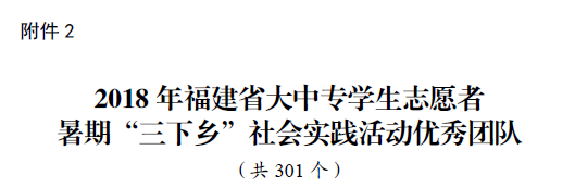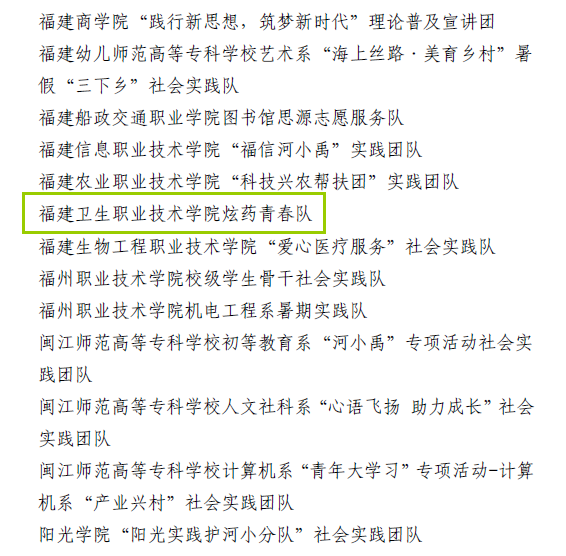 2018年,药学系党总支带领团总支积极响应团省委以“青春大学习 建功新福建”为主题的暑期“三下乡”社会实践活动,近期团省委对 2018 年福建省大中专学生志愿者暑期文化科技卫生“三下乡”社会实践活动中表现突出的单位及个人进行表彰,药学系炫药青春实践队光荣上榜,荣获福建省大中专学生志愿者暑期“三下乡”社会实践活动优秀团队荣誉称号。