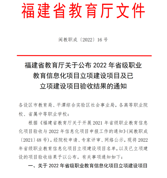近日,福建省教育厅公布2022年省级职业教育信息化项目立项建设项目名单和已立项建设项目验收结果,我校5个项目获批立项,3个项目通过验收。