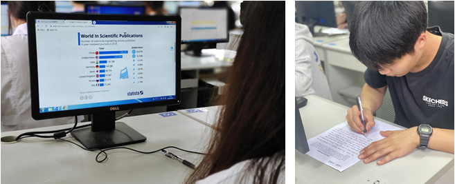比赛中,选手们综合运用英语语言知识,在第一轮图表作文中,阐述中国科技的发展情况,分析背后的原因。在复赛作文中,选手们用英文描述中医专家张伯礼潜心研究医学、为人民服务的光辉事迹,赞扬科学家们淡泊名利的奉献精神与深厚的爱国情怀,表达了对科学家的崇敬之情,坚定了弘扬中华传统文化的信念。