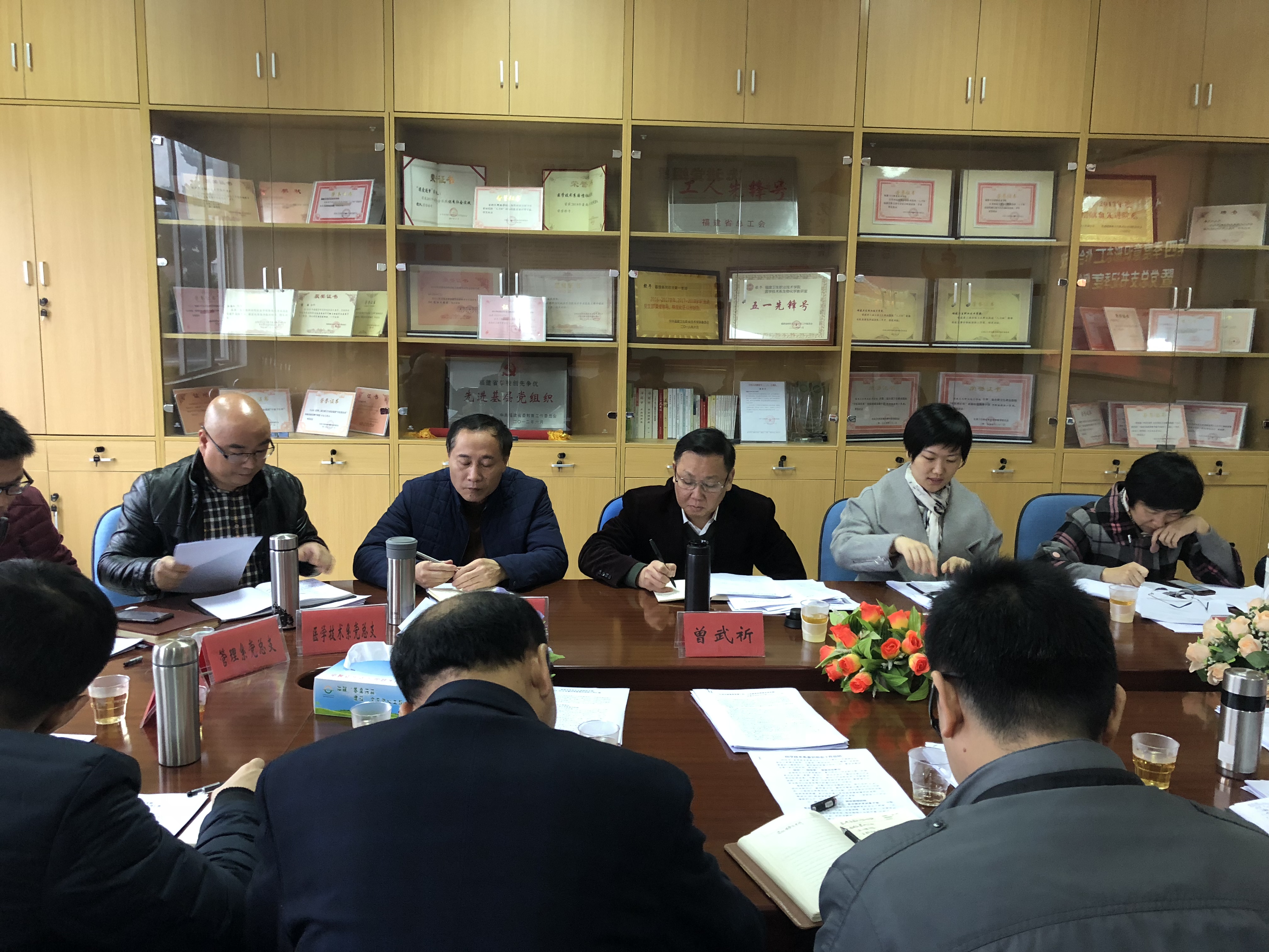 最后,曾武祈书记对各党总支书记的发言作出点评,表扬本次会议形式新颖、内容丰富。在分析研判的基础上,曾书记分享了两点体会:第一,回顾今年,表示慰问。通过各党总支(直属党支部)的不懈努力,今年基层党建工作卓有成效,取得诸多荣誉。曾书记代表党委对同志们表示衷心的感谢。第二,展望未来,寄予厚望。首先,提高基层党建工作标准化建设程度,提炼精华,重点培育党建品牌项目;其次,攻坚克难点,提高教职工对新时代党建工作和高职教育改革新要求的认识,强化基层党组织对党员教师的约束力,加强“双带头”人工程建设;再次,进一步优化“大思政”工作氛围营造和体制机制,激发教职工投入思政教育的主动性与积极性。希望在新的一年,我们的党建、意识形态工作能有新的提升。