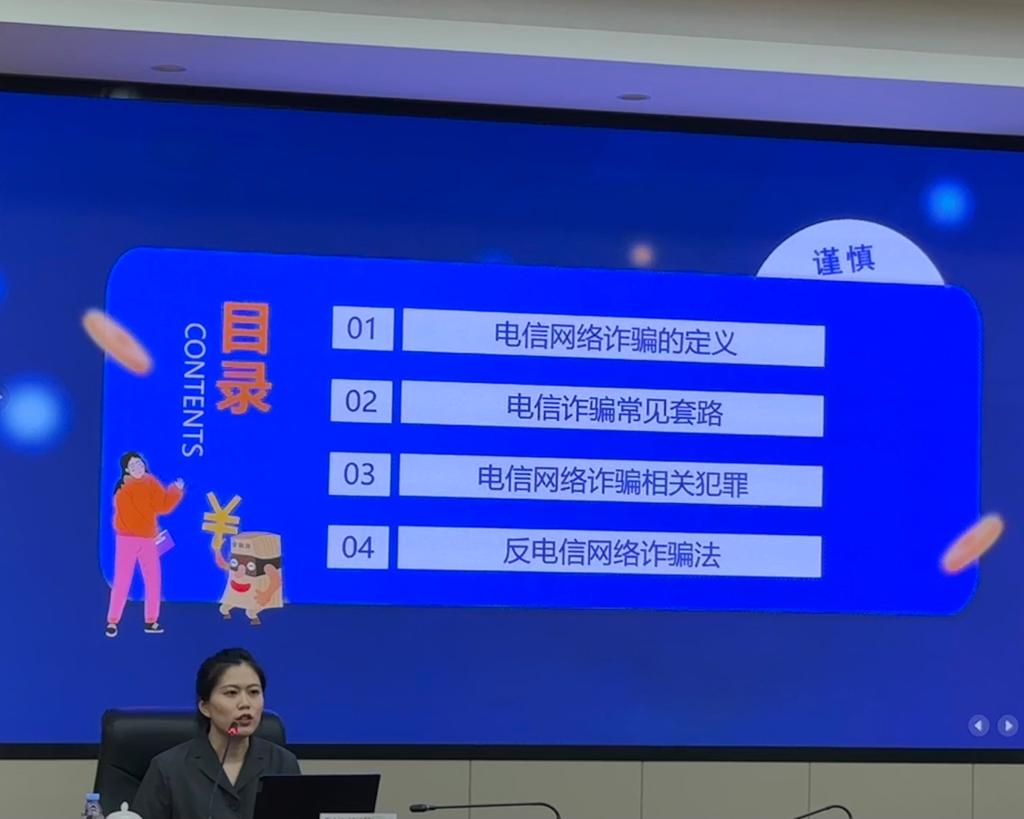 此次培训由闽侯县人民法院陈叶玲担任宣讲人,她围绕电信网络诈骗的定义、电信诈骗常见套路、电信网络诈骗相关犯罪、反电信网络诈骗法四个方面,通过案例分析,以通俗易懂的语言讲解了常见诈骗案件的特点和犯罪分子的惯用手法、作案方式、识别和防范技巧。