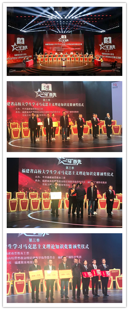 11月26日,第三季福建省高校大学生学习马克思主义理论“一‘马’当先”知识竞赛高职高专组总决赛在福建省广播影视集团二号演播厅落下帷幕。本次比赛由福建省委教育工委主办,福建省高校思想政治理论课教学指导委员会、福建省广播影视集团、东南卫视和福建教育电视台承办。全省共有47所高职高专院校参赛,最终我院代表队以高分获得团体总分第五名,荣获三等奖。学院党委曾武祈书记参加了现场颁奖典礼。