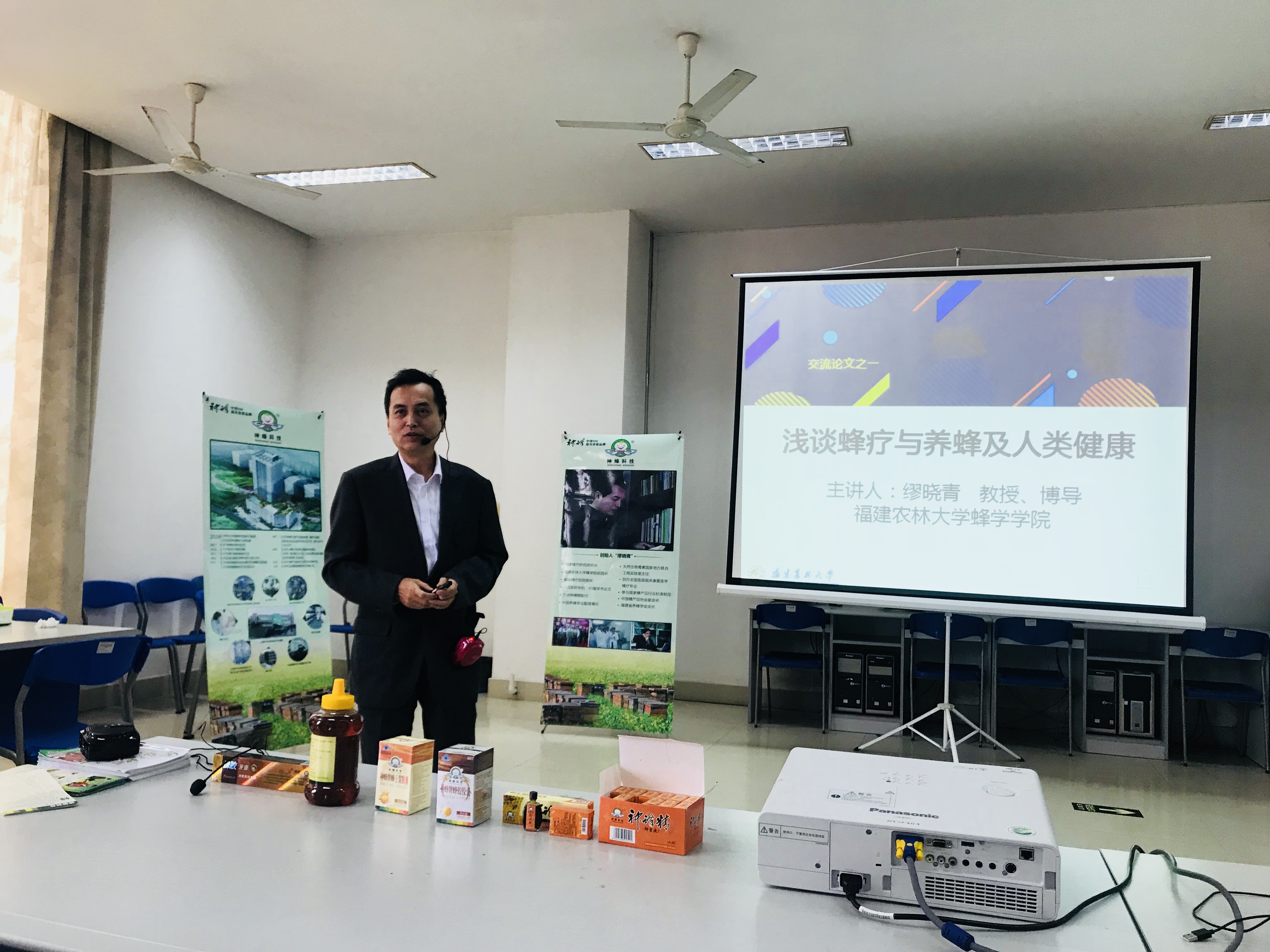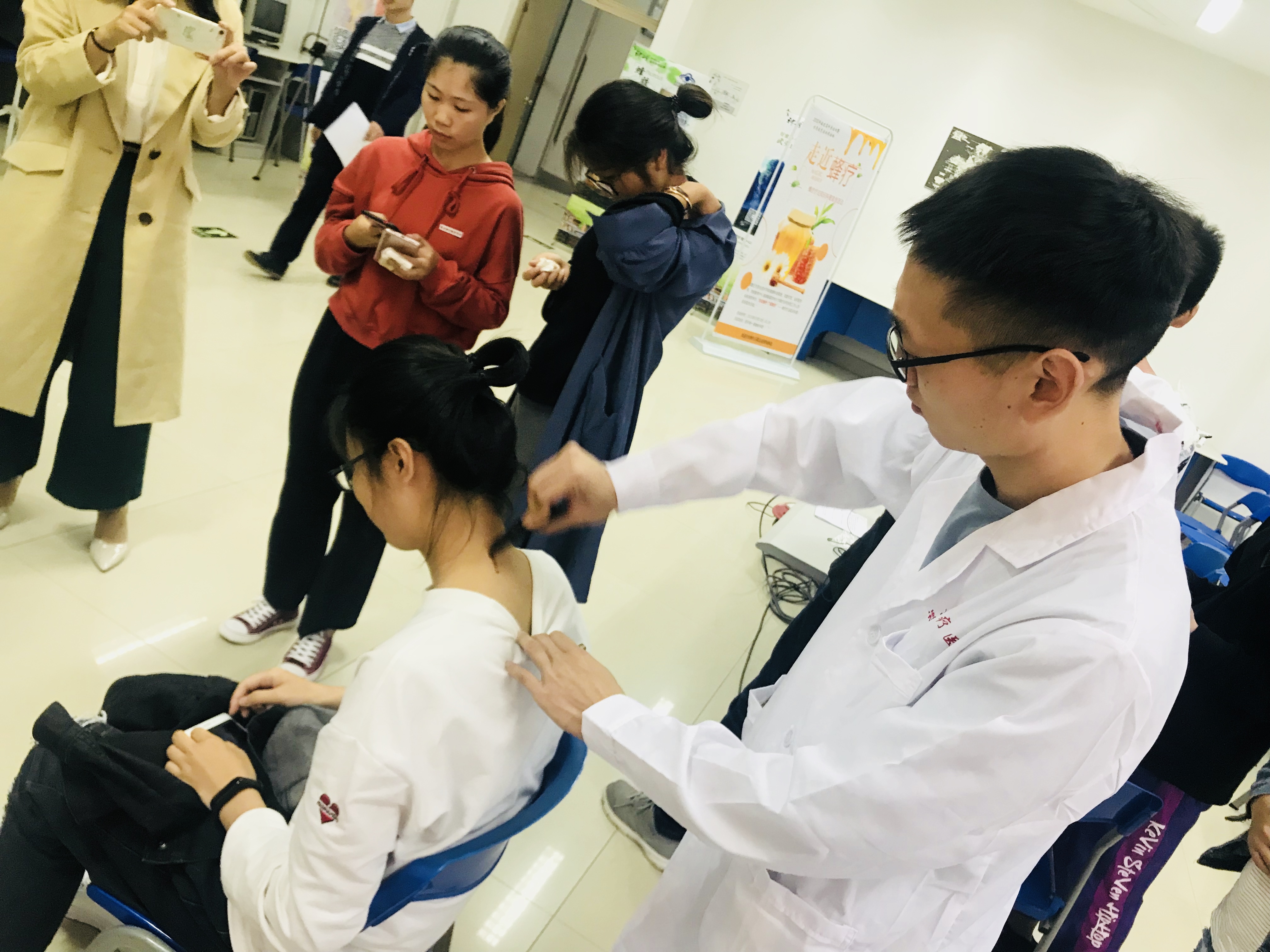 首先,蜂疗研究所市场部经理陈凌鹰向大家介绍了蜜蜂的基本知识和蜂疗研究所的发展历程。接下来,蜂疗研究所所长、福建农林大学蜂学院前院长缪晓青教授结合蜜蜂健康文化,亲自为大家讲述了自己和蜜蜂的结缘故事以及他研究发明神蜂精的历程,对师生的创新创业工作极具启发意义。最后,来自蜂疗医院的医生介绍了蜂疗手法和疗效,并为参与活动的师生们现场实践刮疗手法,大家踊跃参与体验,并纷纷表示这种蜂疗手法效果显著,体验感受很舒适。