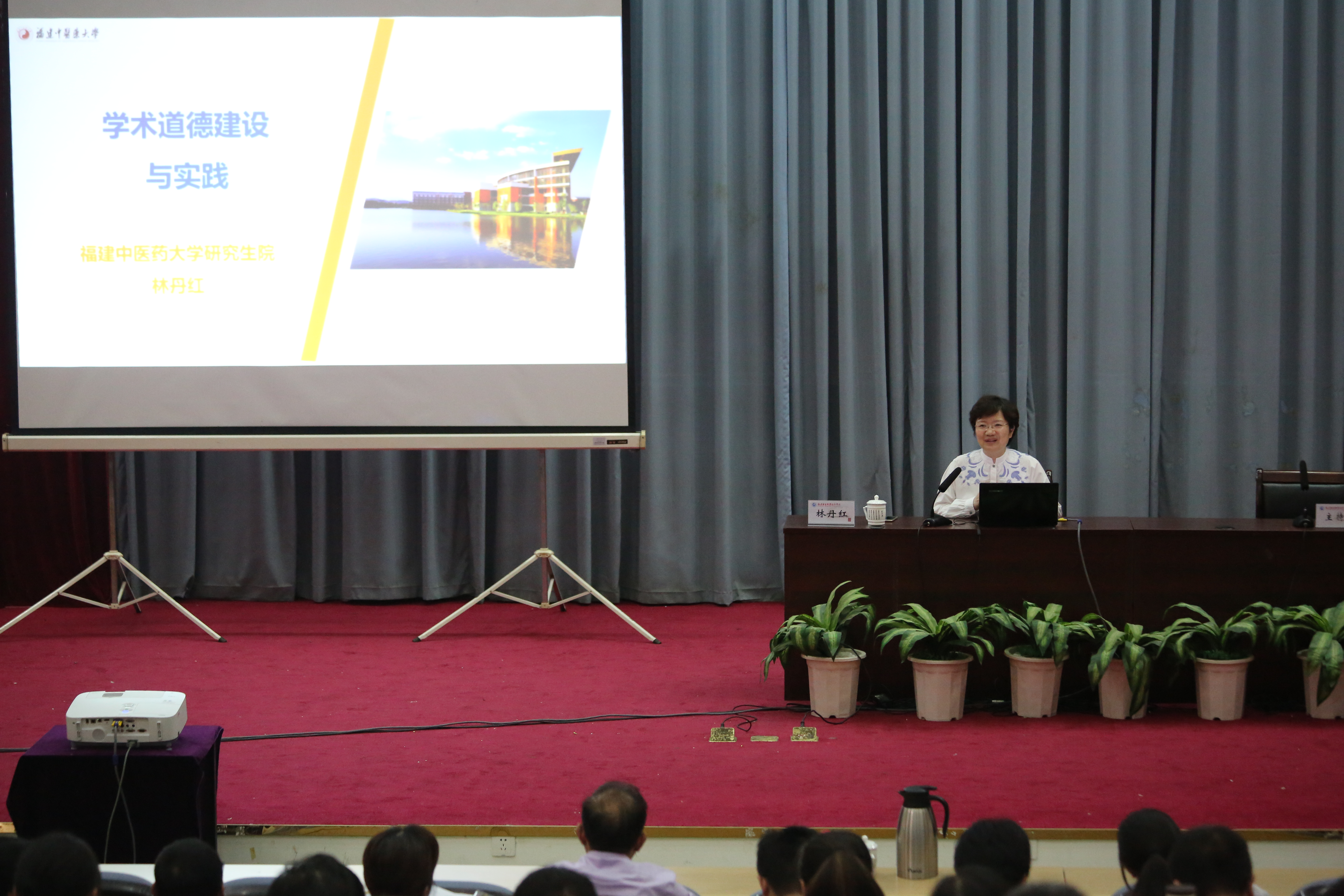 10月25日,福建中医药大学研究生院院长、博士生导师林丹红研究馆员应邀前来我院做《学术道德建设与实践》专题讲座。讲座由学院院长苏友新主持,学院全体教职工参加了讲座。