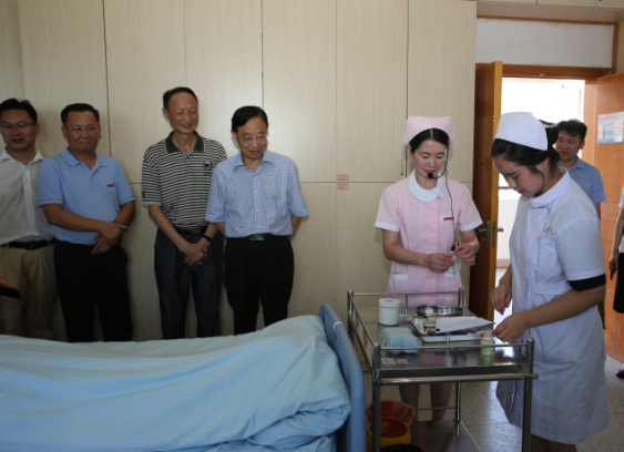 下午,叶会长一行首先来到护理系“精准扶贫班”的专用教室,看望精准扶贫班全体学生,与学生进行了亲切会面和交谈。学生们良好的精神风貌让调研领导们非常欣慰。接着领导们参观了护理系实训室,观看精准扶贫班学生进行专业课的实训操作,对教师的严谨教学和学生认真学习的态度给予了肯定。最后,领导们来到护理系会议室,与师生代表进行座谈。