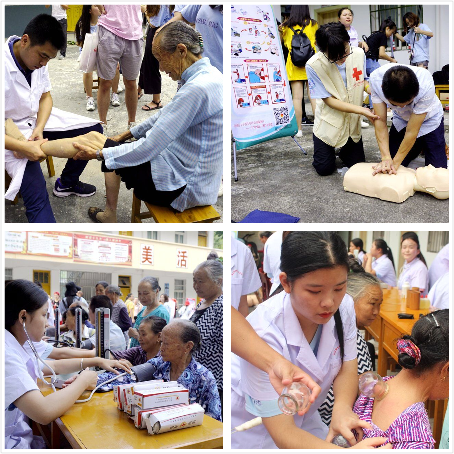 爱心医疗为群众,青春建功新时代。实践团成员们在岭腰村为村民们送医送药,提供免费测量血压、按摩、拔罐、刮痧普等医疗服务。他们教授村民心肺复苏和急救包扎技能,普及保健知识,传播健康理念。前来的村民络绎不绝。队员们以自己所学的知识技能为颜料,以实践为画笔为村民勾勒健康的笑脸。“建宁苏区风光秀,莲城风采惹人迷。水尾红军旧址存,长征之路勇前行。岭腰义诊为人民,亲身慰问暖人心。纸上得来终觉浅,绝知此事要躬行。” ——房鑫同学赋诗一首