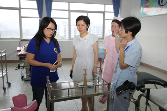 妇儿护理教研室主任陈顺萍(右一)向廖怡惠主任介绍产科实训器材