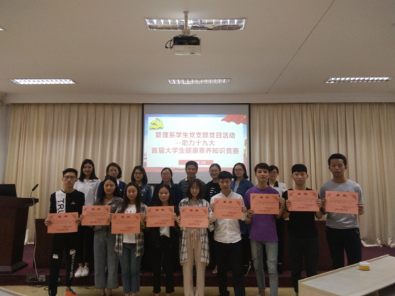 为认真宣传贯彻十九大会议精神,实施健康中国战略,践行全民健康素养促进行动计划,增强预备党员和入党积极分子践行十九大精神的意识与决心,4月26日午,在管理系学生党支部教师党员的带领下,“助力十九大”系列主题党日活动之管理系首届大学生健康素养知识竞赛在行政楼六楼会议室火热开展。管理系党政负责人、管理系各党支部书记以及学生党支部教师党员们参加本次活动。